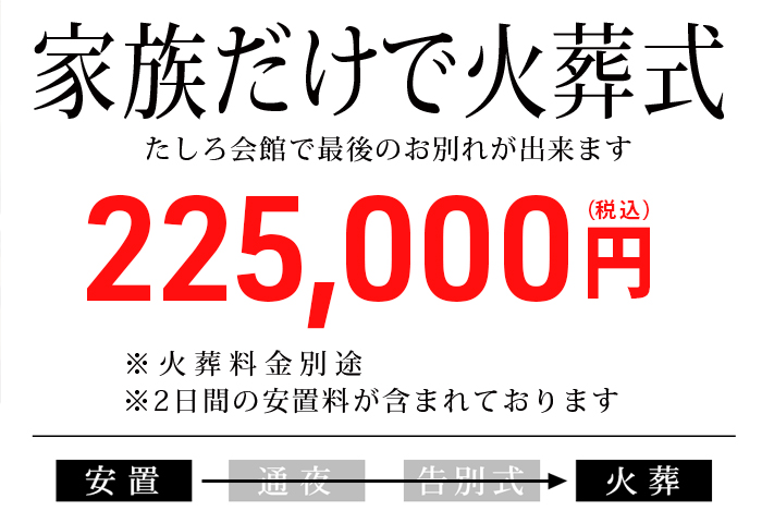 家族だけで火葬式 ・10名様前後での少人数でご利用頂けます。 ・家族葬・友人葬・無宗教お別れ会・火葬式あらゆるお葬式のお手伝いを致します。 ・全宗旨、宗派問わず宗教者をご案内致します。 ・お迎えから葬儀の流れについては専任担当者が丁寧に説明致します。 すべてのプランにおいては事前相談をお勧め致します。たしろ会館までお問い合わせください。